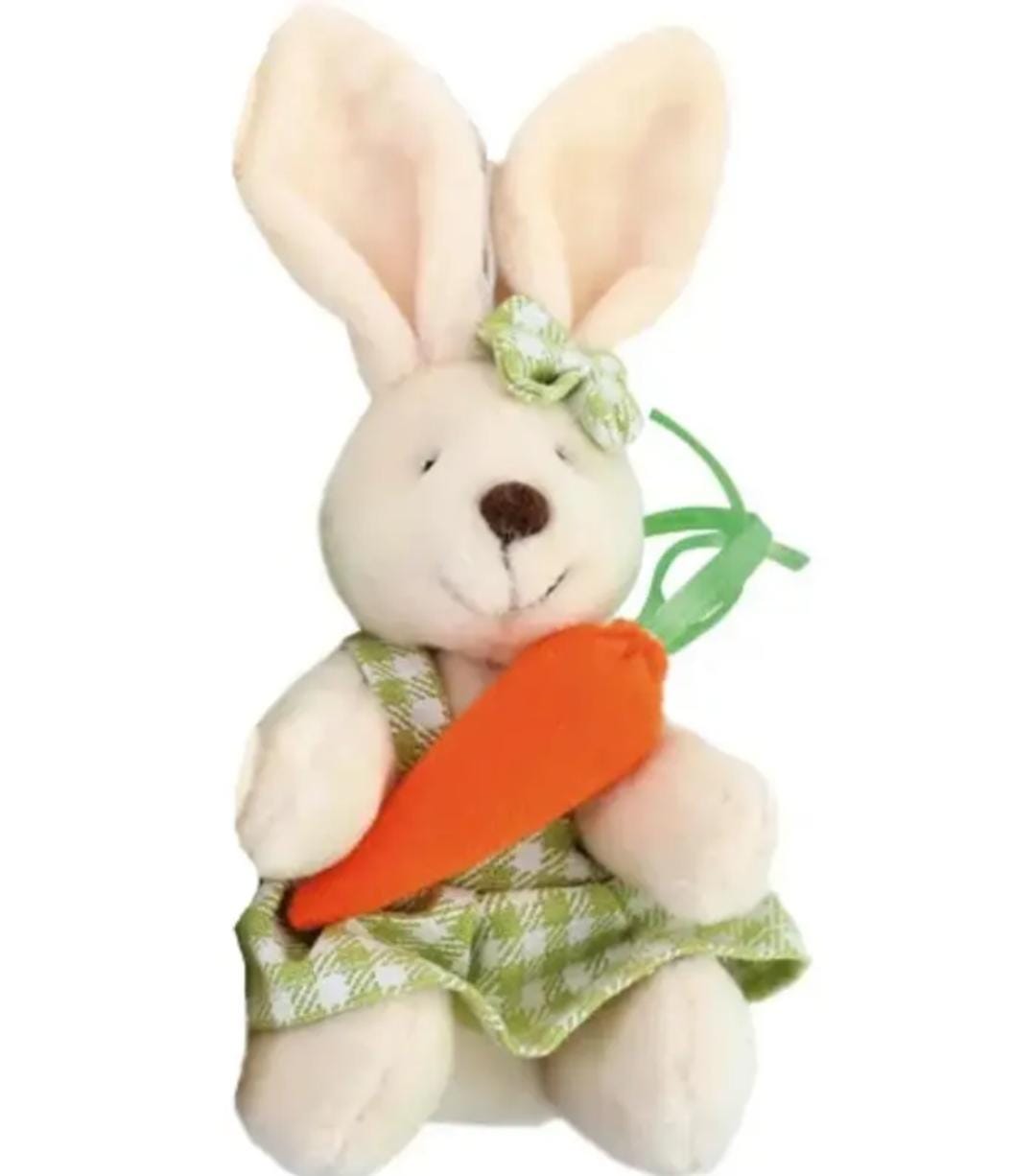 Descrição: Coelho decorativo branco de pelúcia com cenoura sortido rosa, azul e verde. Alimente o espírito de páscoa e alegre toda a casa e as crianças com os nossos coelhos fofinhos!