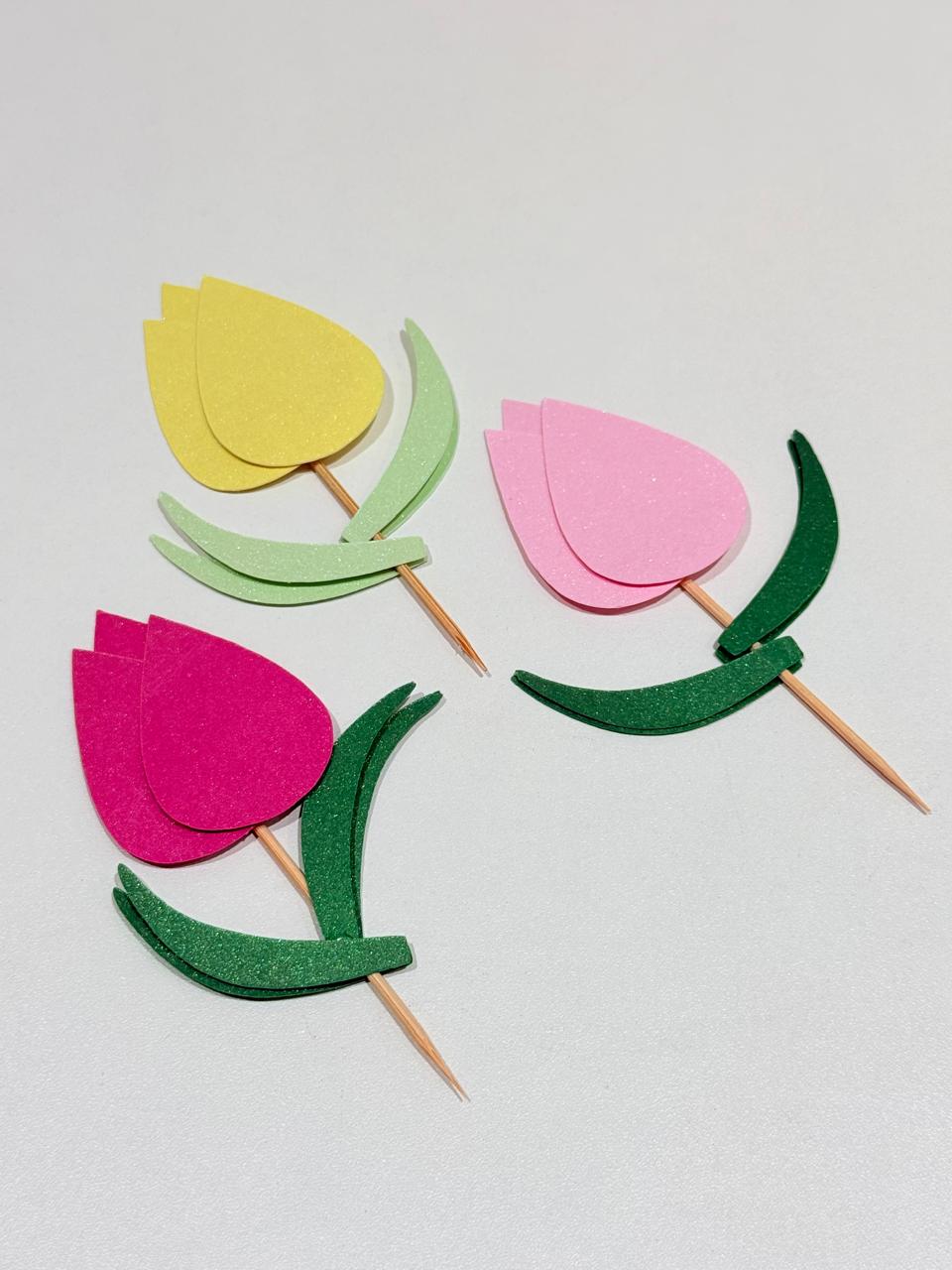 Descrição: Topper de doce tulipas de papel descartável, com cores (rosa, laranja e roxo). Deixe a mesa das crianças ou até a mesa do bolo encantadora com os nossos topper de doce.