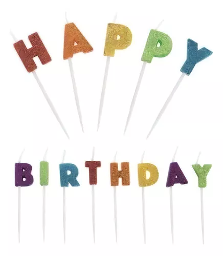 Descrição: Vela letras coloridas happy birthday com glitter. cada letra com uma cor diferente para deixar mais divertido a sua festa.