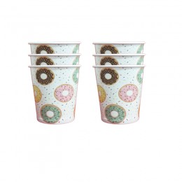Descrição: Copo de papel descartável branco com estampa de granulados e donuts coloridos. Dê um charme extra à sua comemoração!