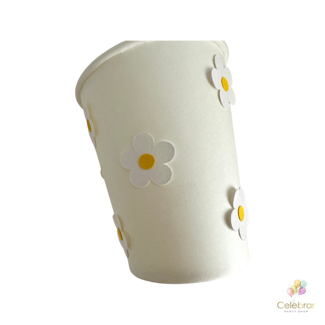 Descrição: Copo de papel descartável liso branco com apliques de mini margaridas em todo o entorno.