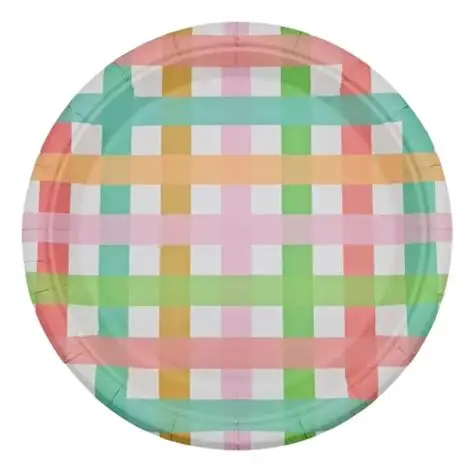 Descrição: Prato de papel descartável com estampa xadrez colorido.