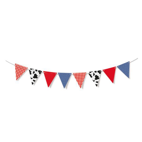 Descrição: Faixa decorativa com 8 bandeirolas em estampadas (azul, xadrez vermelha, poá vermelho, e malhada)