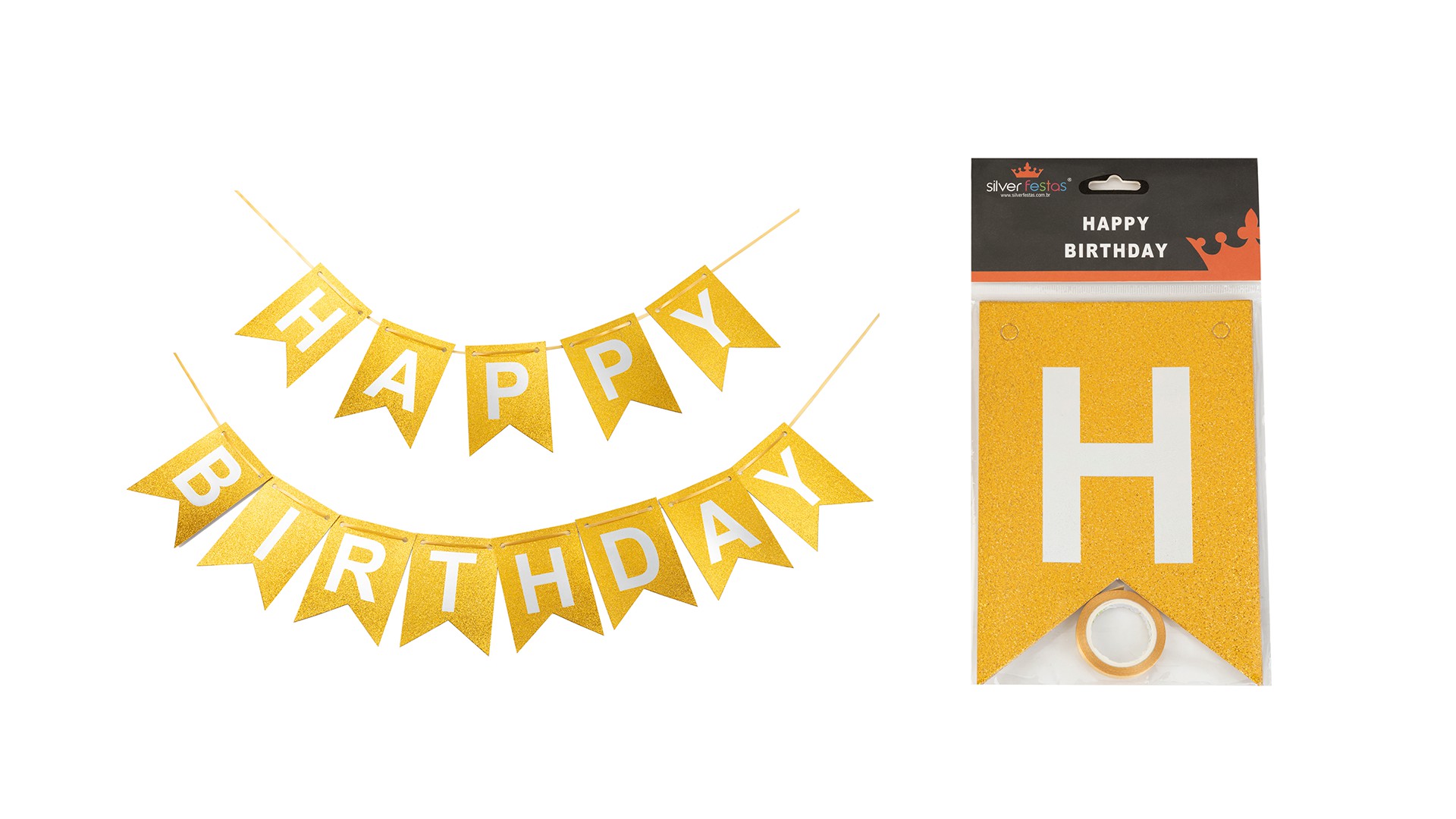 Descrição: Faixa decorativa happy birthday, letras prateadas e glitter dourado.