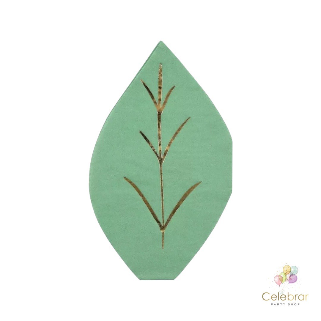 Descrição: Guardanapo de papel em formato de folha verde e dourado.