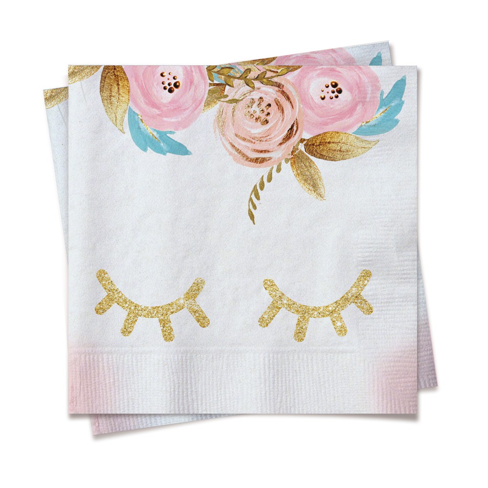 Descrição: Guardanapo de papel formato quadrado no tema unicório com estampa de olhos de unicórnio.