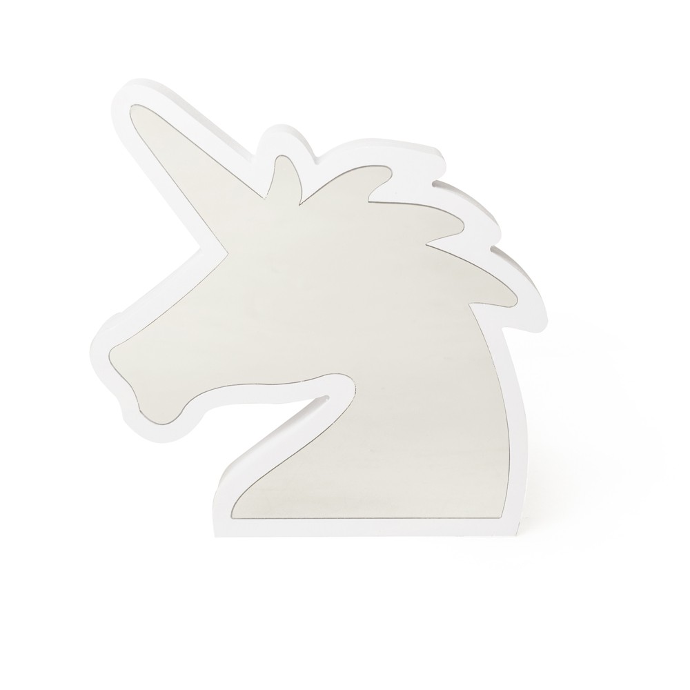 Descrição: Luminoso em formato de unicórnio branco em madeira, com espelho na frente.