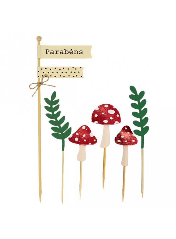Descrição: Topo de bolo cogumelos de parabéns. Deixe sua festa ainda mais linda e divertida!