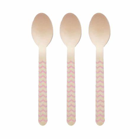 Descrição: Colher de madeira zig zag com detalhes estampados de rosa.