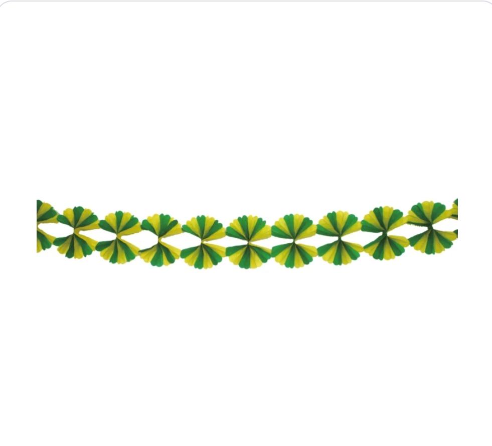 Descrição: Faixa decorativa de papel amarelo e verde. Para deixar seu ambiente mais decorado nessa Copa.