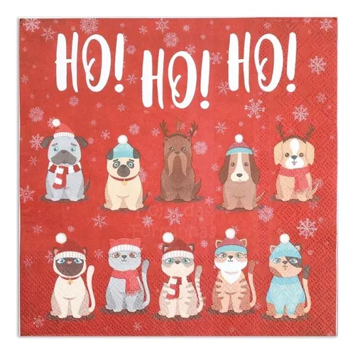 Descrição: Guardanapo pets ho ho ho de natal. Contendo (cachorro e gato). para deixar sua mesa natalina charmosa e especial nessa data tão importante.