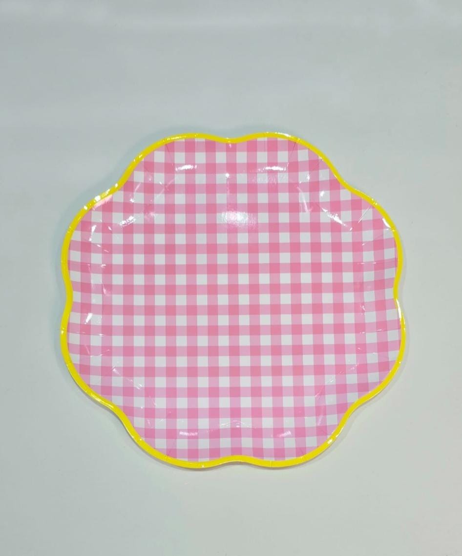 Descrição: Prato de papel xadrez descartável. Varia entre as cores rosa,verde e laranja. *** Enviamos Conforme
