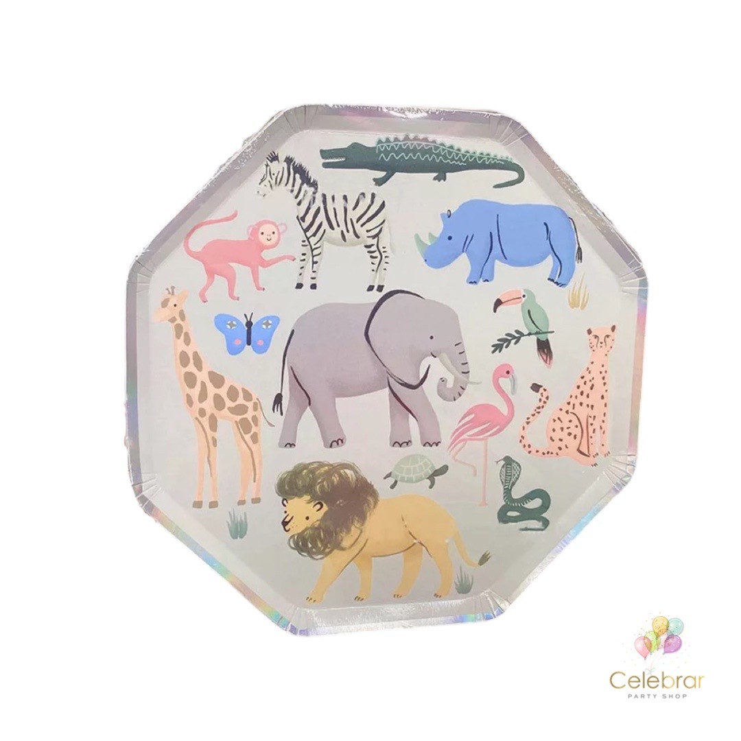 Descrição: Prato de papel com estampa soft de animais (zebra, jacaré, rinoceronte, tucano, borboleta, elefante, onça, flamingo, cobra, leão, girafa, macaco e etc) e borda furtacor.