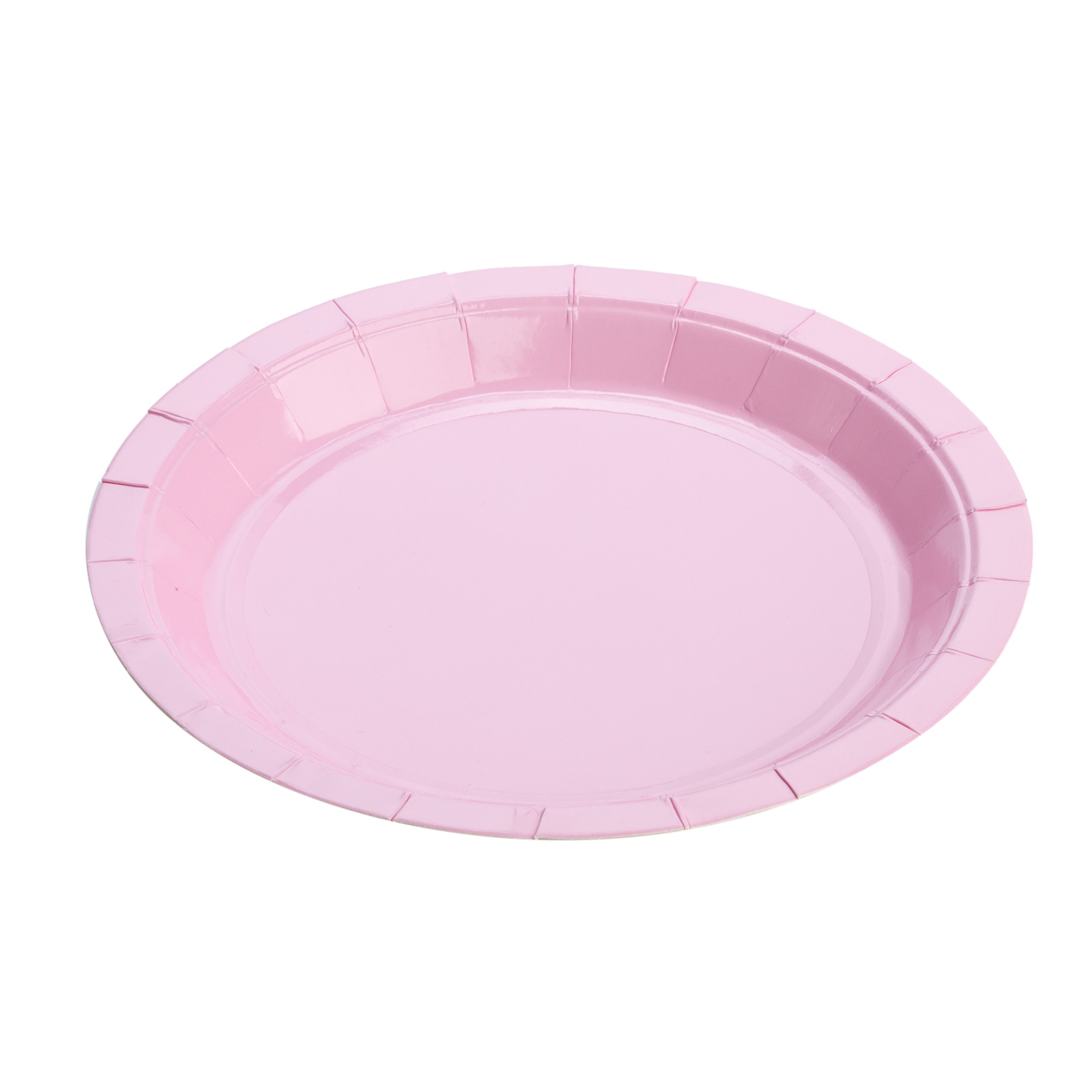 Descrição: Prato de papel descartável redondo liso rosa bebê