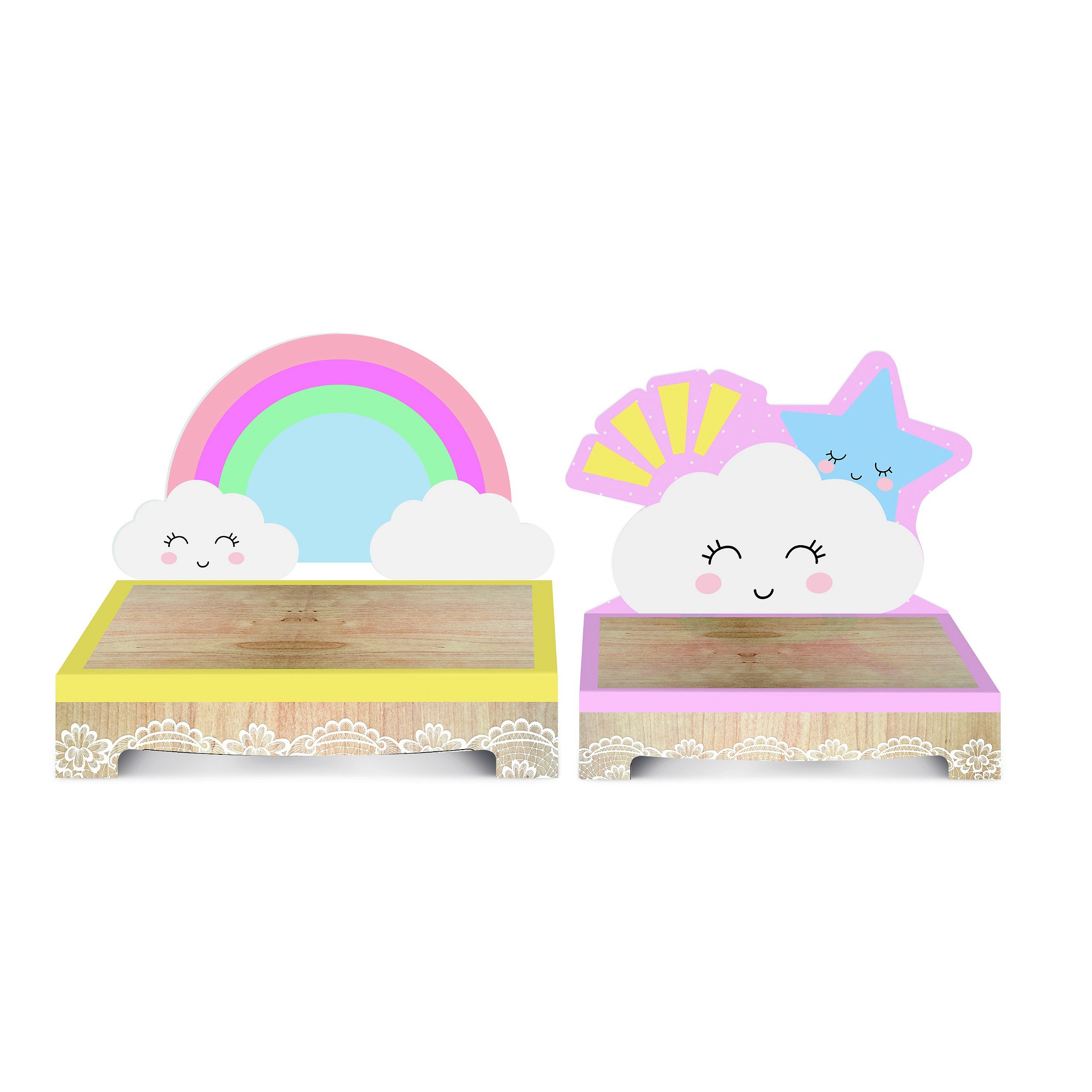 Descrição: Suporte para doces no tema arco-íris, com arco-íris, estrela e nuvem em tons claros. Perfeitos para enfeitar sua mesa de aniversário e ao mesmo tempo colocar doces, sanduiches, etc. Ótimo custo benefício.