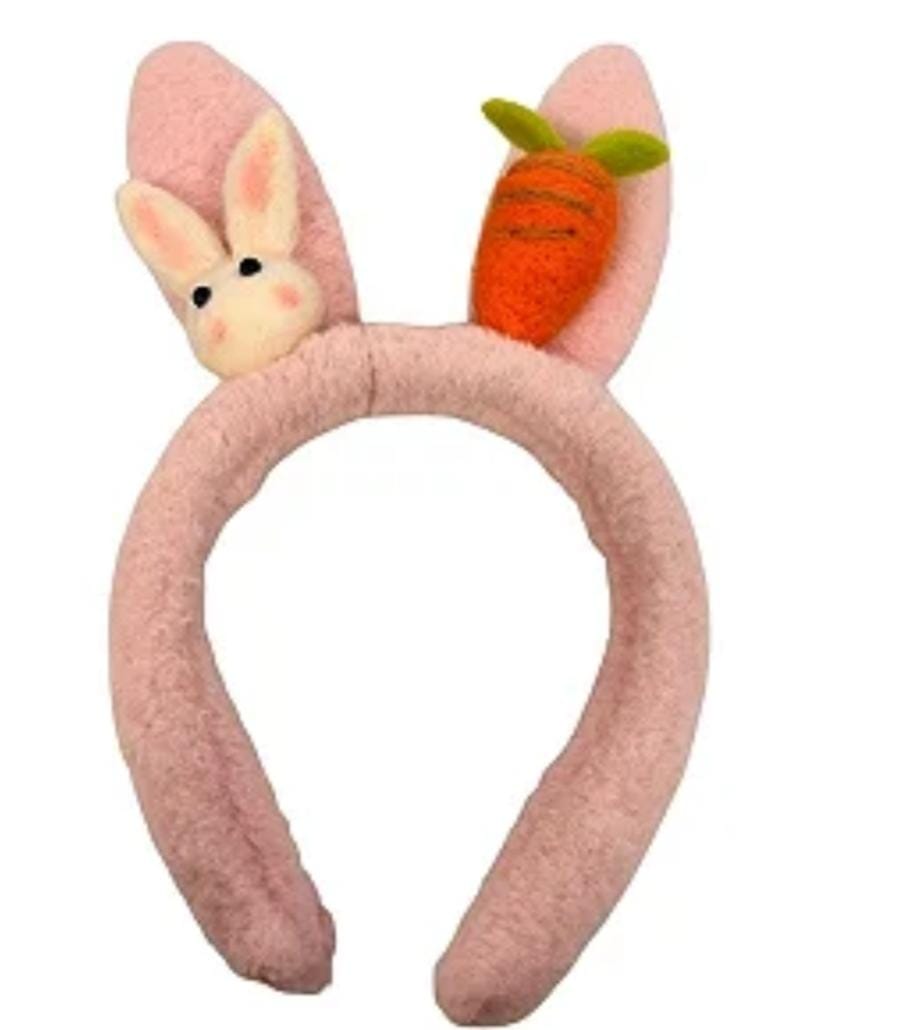 Descrição: Tiara de pelúcia rosa, com orelhinhas de coelho, rostinho de coelho e cenoura em pelúcia. Perfeita para uma páscoa mais feliz e divertida!