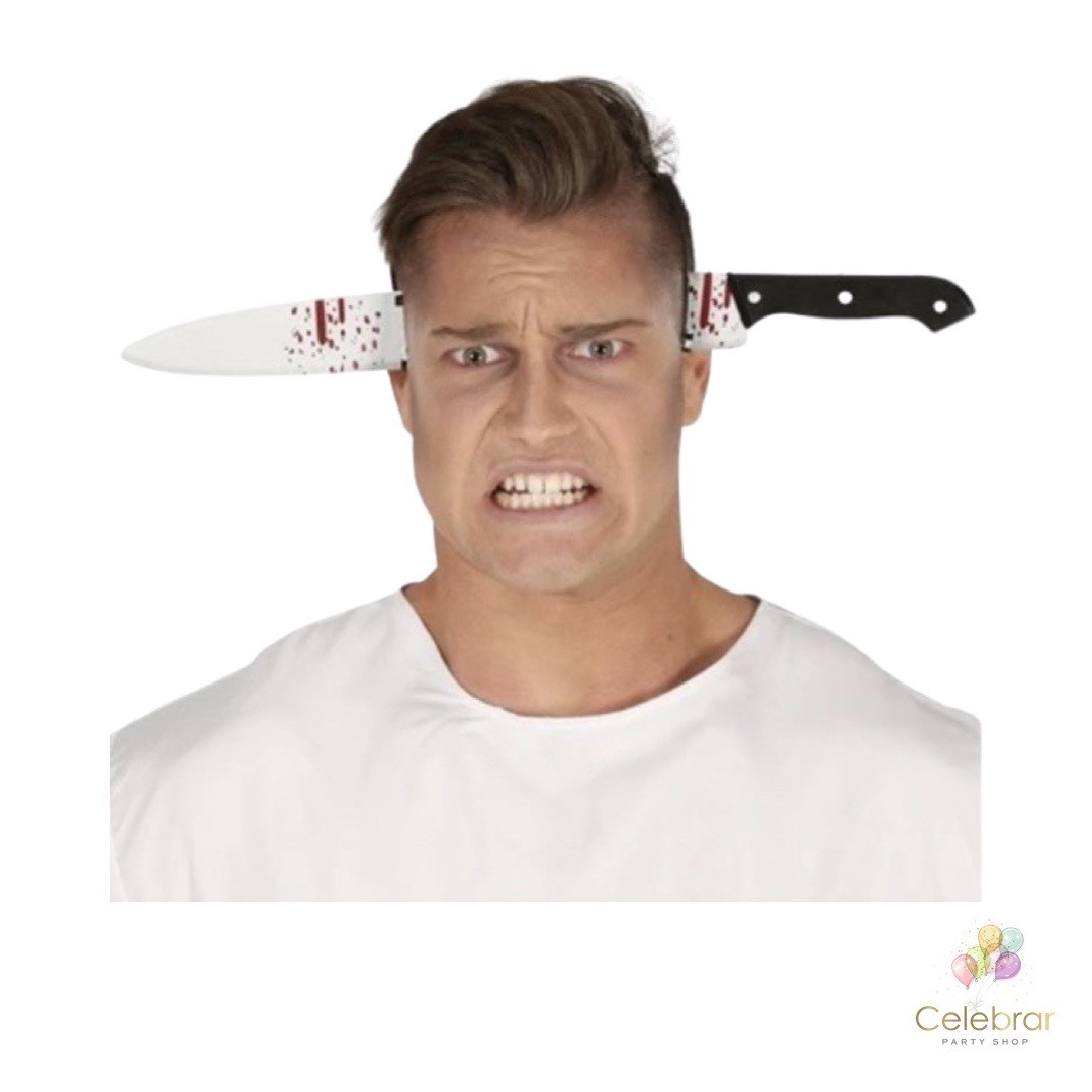 Descrição: Tiara imitando faca sangrenta na cabeça.