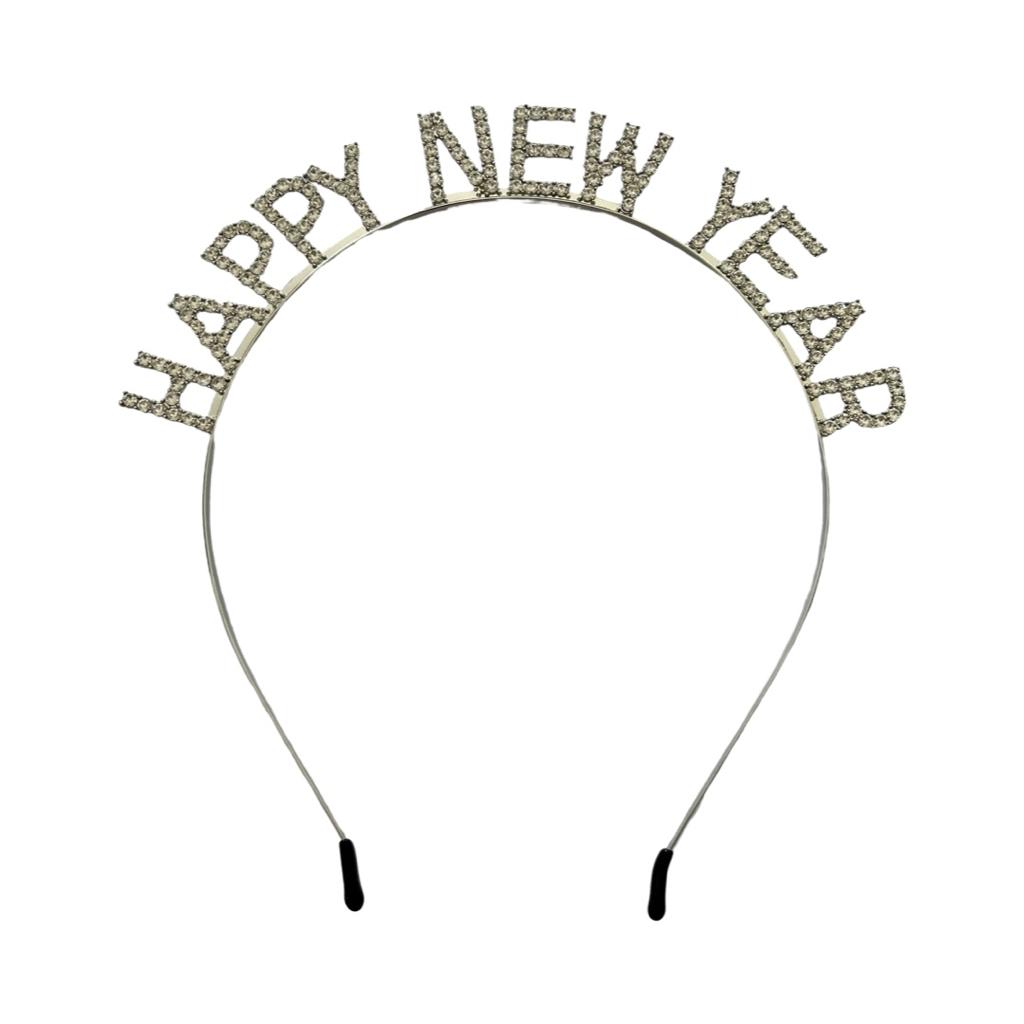 Descrição: Tiara de prateada com escrito Happy new year em strass.