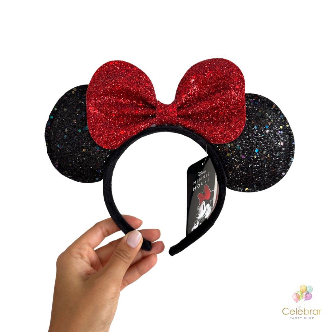 Descrição: Tiara Minnie, preta com laço vermelho, toda com glitter! Linda! Perfeita para você arrasar no carnaval, nos blocos, na rua, no clube ou na avenida! Versátil e leve, veste adultos e crianças.