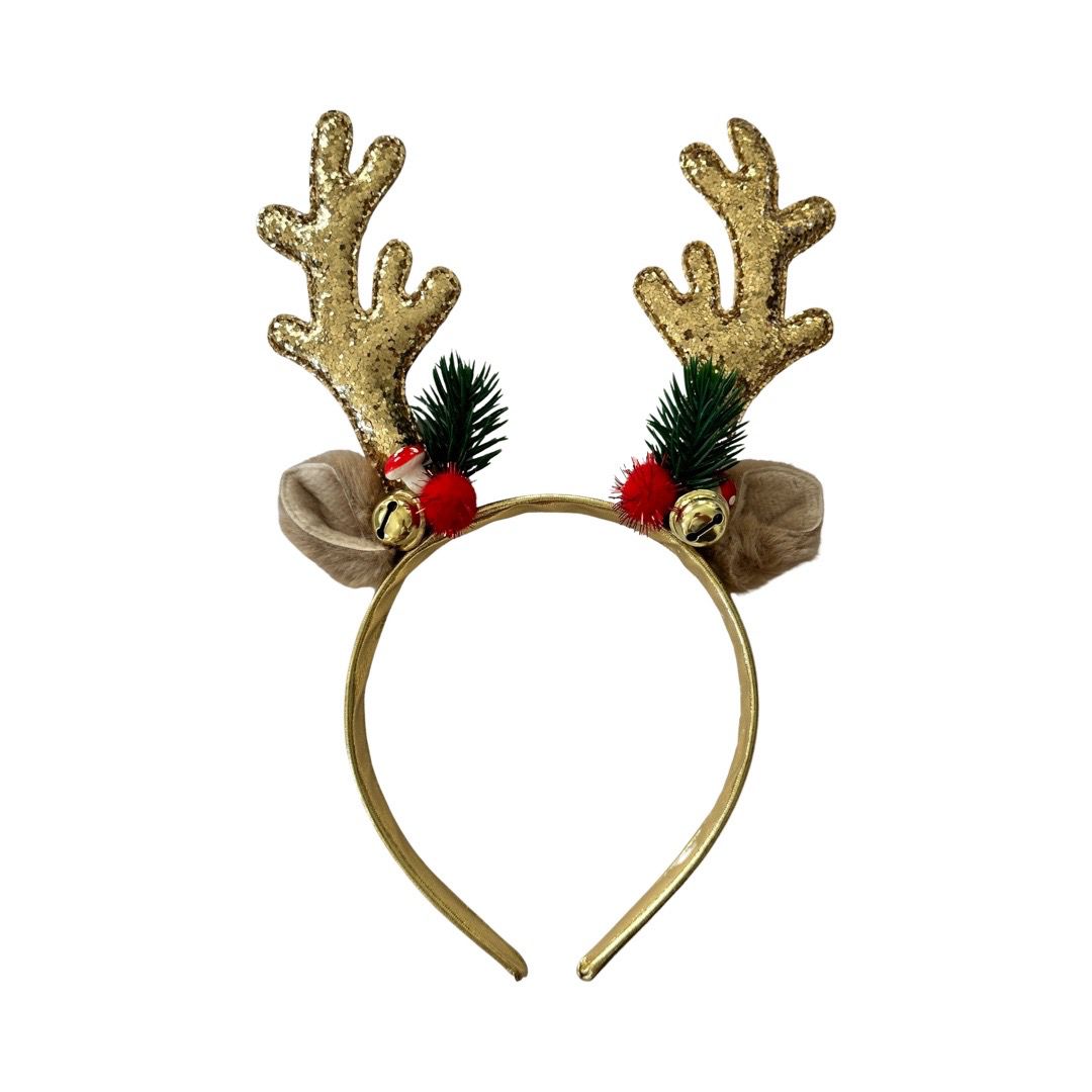 Descrição: Tiara de natal com orelhinha e chifrinho de rena dourada com pequeno detalhe em vermelho. Haste dourada.