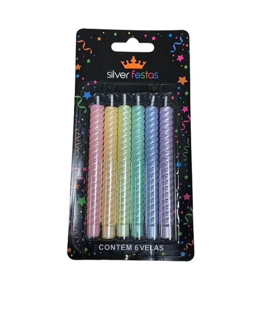Descrição: Vela espiral colorida metalizada (pink,azul, lilás, amarelo e laranja). essa vela é muito charmosa completa e alegrar qualquer bolo.