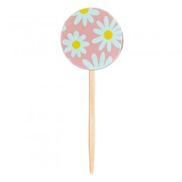 Descrição: Topo de doces e salgados redondo rosa com estampa de margaaridas. Já vem montado! Deixe sua festa ainda mais linda e divertida! Aproveite e use como decoração na mesa do bolo, fica lindo!