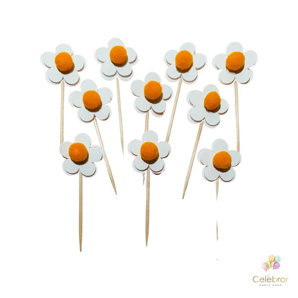 Descrição: Topo de doces em formato de margaridas brancas com pompom amarelo no meio. Perfeito para enfeitar seus doces, salgados e deixar sua mesa ainda mais linda! Experimente também misturar vários toppers com velas de formatos e tamanhos variados.