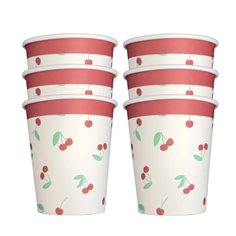 Descrição: Copo de papel descartável com estampa de cerejas! Experimente misturar estes copos e deixe essa celebração ainda mais especial.