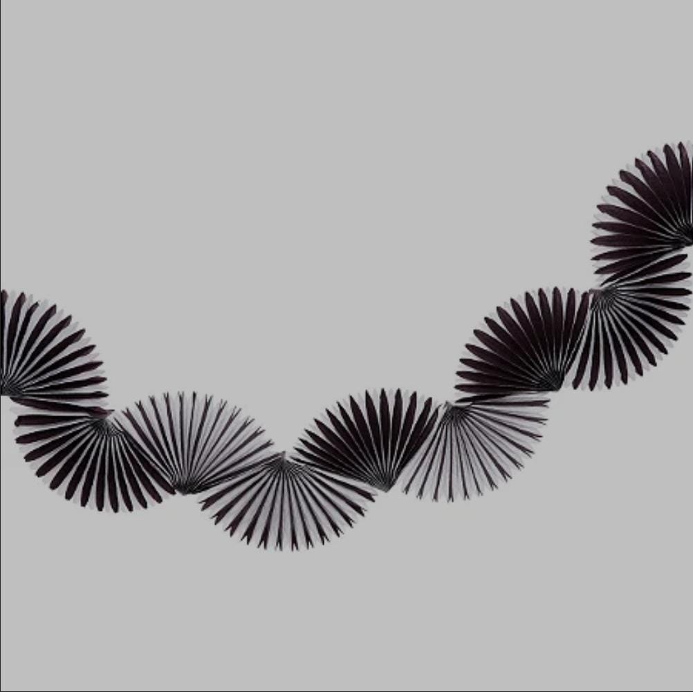 Descrição: Guirlanda de leques de papel de seda cor listra preto e branco. Deixe sua festa ainda mais linda e divertida! Aproveite e use como decoração na mesa do bolo, pendurado ou na barra da mesa, fica lindo! Guirlanda já vem montada.