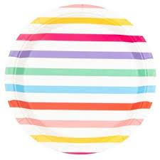 Descrição: Prato de papel listra colorido. Deixe ainda mais sua mesa mais linda com esses pratos.