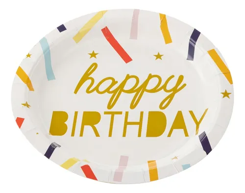 Descrição: Prato de papel descartável happy birthday com confetes coloridos.