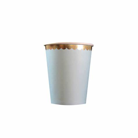 Descrição: Copo de papel descartável azul com borda dourada. Dê um charme extra à sua comemoração!