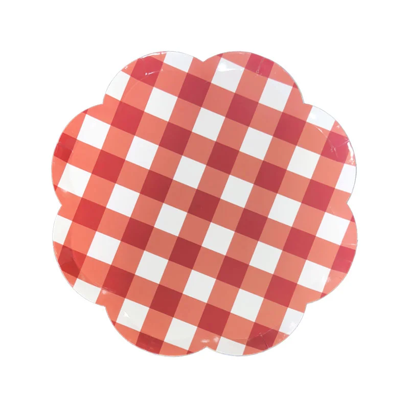 Descrição: Prato de papel com bordas recortadas, fundo rosa e estampa xadrez vichy vermelho. Resistente e lindo!